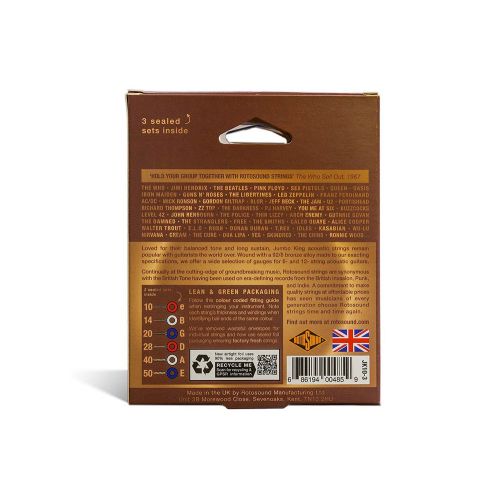 Rotosound's best selling acoustic string. Phosphor Bronze wound Acoustic Guitar strings with superb warm tone, clarity and sustain. Favoured by such artists as John Renbourn, Bob Geldof and Gordon Giltrap.
