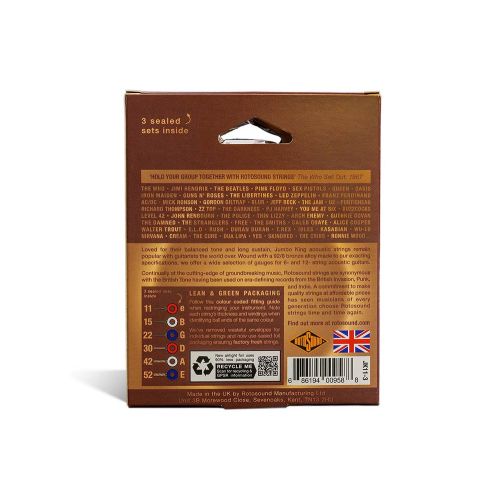 Rotosound's best selling acoustic string. Phosphor Bronze wound Acoustic Guitar strings with superb warm tone, clarity and sustain. Favoured by such artists as John Renbourn, Bob Geldof and Gordon Giltrap.