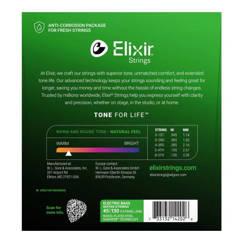 Elixir®- Nickel plated stalen bassnaren met een NANOWEB®-coating zorgen voor een rijke, afgeronde klank , meer helderheid en een zwaarder middenbereik.