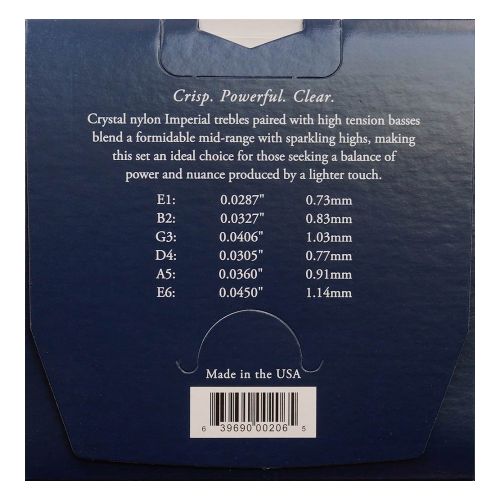 Imperial trebles Blue basses - medium tension trebles gemaakt van Augustine's "nieuwe en unieke" polymeer, met Blue bassen - hoge spanning - dikste koper omwonden bas snaren