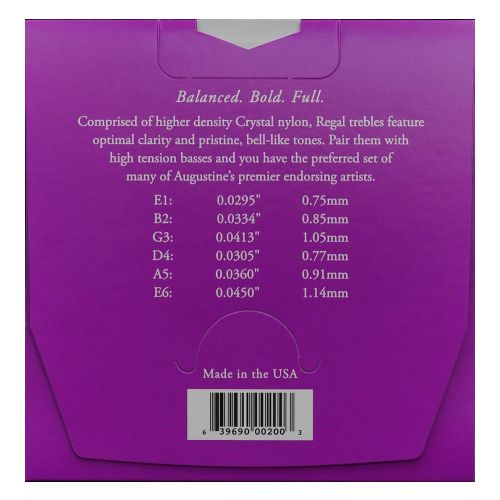 Augustine Regal Blue High Tension, volledige Set. Trebles van doorzichtig nylon, met verzilverde bassen.