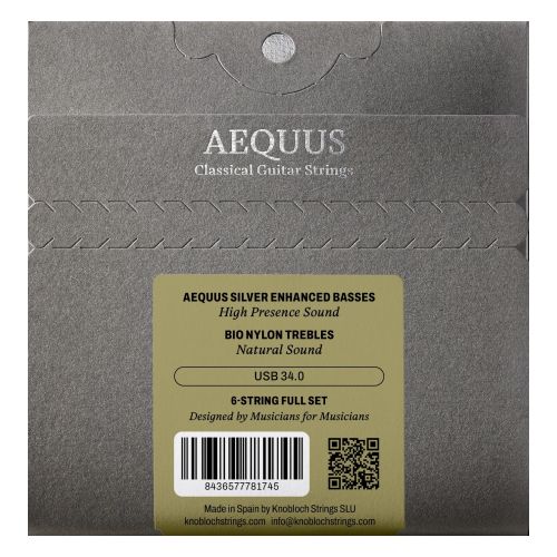 Aequus Silver Enhanced basses project each note with stability, maintaining precise harmonic balance across bass, midrange, and treble. Their character is especially evident in the mid register, where the guitar resonates with greater richness and control. BIO Nylon trebles have been technically refined to ensure faster and more precise adaptation to the instrument. Thanks to their optimized balance, they deliver a more natural and expressive tone in the upper register, completing the overall balance of the set. A high-performance string, meticulously designed to deliver precision and control across the entire range. For musicians seeking balance, control, and a present sound with enhanced detail and definition.