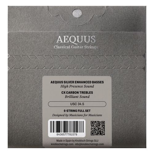 Aequus Silver Enhanced basses project each note with stability, maintaining precise harmonic balance across bass, midrange, and treble. Their character is especially evident in the mid register, where the guitar resonates with greater richness and control. CX Carbon trebles bring clarity, projection, and precise articulation to the set, enhancing its overall definition and strengthening its presence in the upper register.A high-performance string, meticulously designed to deliver precision and control across the entire range. For musicians seeking balance, control, and a present sound with enhanced detail and definition.