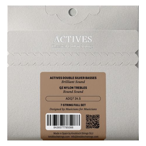 The Knobloch Actives product line enhances the musical expression of the guitarist by providing more security, comfort and ease in realizing the interpretation. Knobloch Actives strings offer: A wide range of colours and enhanced resonance through the use of high-quality materials. An extremely responsive touch with good vibrato. A perfect balance that makes the tension of the strings unnoticeable. A greater resilience and durability thanks to the selection and quality control of superior materials. For nylon string enthusiasts we have paired the newly adapted Knobloch Active Q.Z. basses with the new generation of more refined and sweeter Nylon Q.Z. trebles. The result is balanced volume and string diameter which produces a rich, round and pure sound. .
